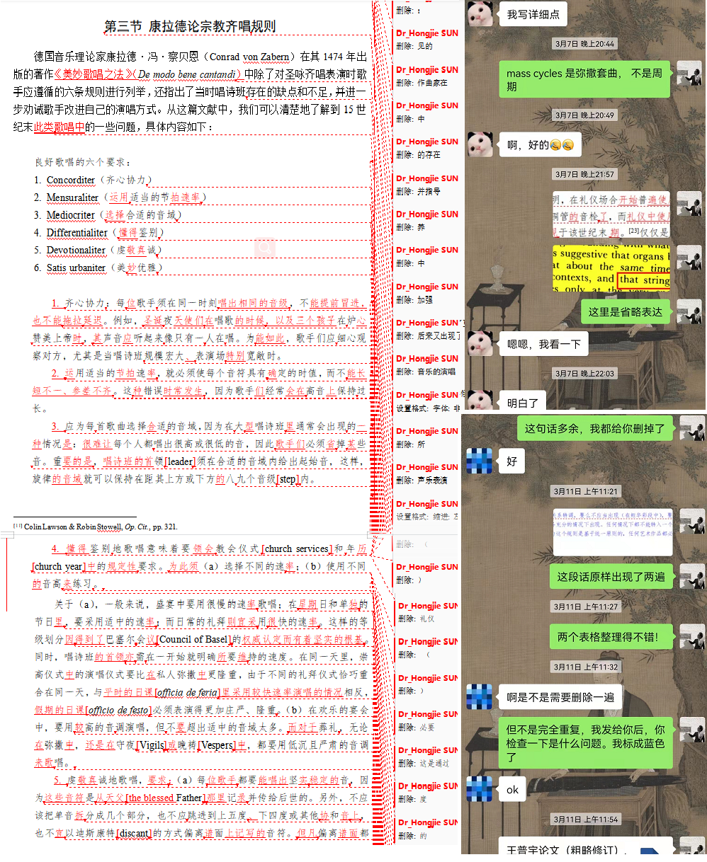 其三是借助邮件或微信的个别指导,尤其针对毕业班的研究生。孙红杰教授习惯于逐字逐句地审阅每位毕业生的学位论文或学位译作,并及时向学生反馈修改意见。他认为这是一种教学相长的过程,通过复核、校阅学生查阅的外语文献,自己总能有新的收获。