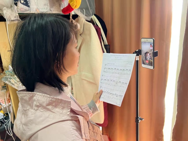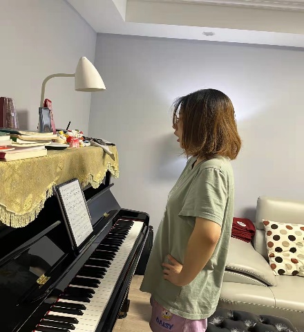我是声乐专业的学生,在没有钢琴的情况下,练声和练歌是个不小的问题,而且一栋楼里还住着其他学院的同学,唱歌时多少还是会有些扰民。为了克服这些困难,我选择在午饭前后小声练歌,用手机上的钢琴软件来纠正音准。导师的家中有钢琴克服了我隔离地点没有钢琴的状况。导师声乐的示范和肢体动作的描述,都让我很清楚的了解到他想表达的意思并且做出回馈。所以线上的声乐专业课也能让我学到很多。