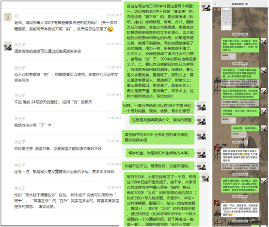 其二是微信群师门交流,每日不定时进行。内容丰富,如交流学术见解、互通研究文献、报告学术动态,议论生活热点,以及——最重要的——分享自己的“每日三百字”,这是孙红杰教授对在读研究生进行日常写作训练的一种方式。“三百字”话题不限,但须每日动笔,节假日亦不间断,且严守篇幅(含标点,不多不少),要用三百字呈现一个相对完整的意思。孙教授认为,这样的“微习惯”很能训练思维和表达能力,因篇幅有限,学生不得不字斟句酌,学会“做减法”,删掉冗余的字词,以便让语言凝练、表达明晰,从而逐步靠近“言简义丰”的理想。孙教授会对每日三百字进行点评和建议,以使学生明白其中的问题和努力的方向。