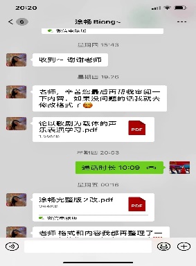 这次因突如其来的疫情而重启的线上专业课,吸取了上一次的经验,进行得十分顺利。我和郭老师用微信视频通话进行课程,由于网络延迟问题,我采用自弹自唱的方式来上课,便于过程中老师发现问题时能够立即纠正。这样做不仅提高了上课的效率,还额外锻炼了我自己的专业技能。疫情期间,通过线上教学的模式,让我们暂时脱离了原先传统的上课模式,转而采用新的教学方式,这让学生可以从多方面得到训练,做到即使在家也不放松练习。