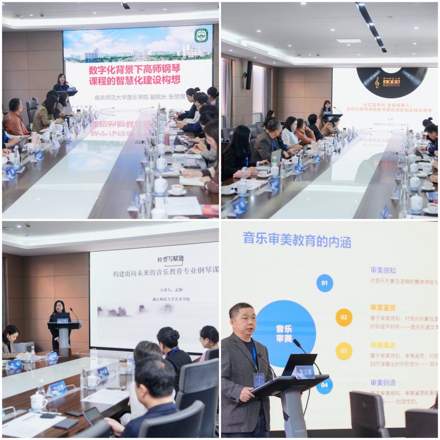 论坛上付镜伊副教授代表南京师范大学音乐学院聚焦数字化背景,提出高师钢琴课程智慧化建设构想。她强调需要实现人才培养思维转向,从图谱体系、教学模式、智慧评价、数字教材四方面推进建设。杭州师范大学音乐学院钢琴系主任金慧教授向大家分享了“全实践导向,全领域育人”的经验,她介绍了所在音乐学院的课程设置与比赛实践活动,重点阐述“民生乡建艺术团”以坛头村为例的乡村实践成果,凸显音乐赋能乡村建设、助力共同富裕的重要价值。浙江师范大学音乐学院学科主任孟颖教授结合综合院校教学实际,探讨音乐教育专业钢琴课程的定位与属性。她提出构建“四位一体”未来课程新模式,通过内容模块化、教学混合化、体系矩阵化等路径,培养“学者型教师”。安徽师范大学音乐学院键盘系主任张旭良教授立足音乐审美教育,解读义务教育美育课程标准。他分析了普通高校音乐教育专业钢琴课程建设的“痛点”,并提出针对性建设构想。