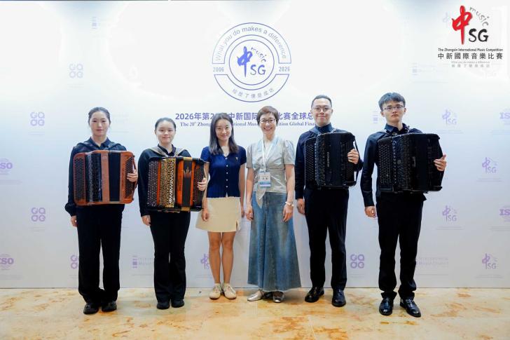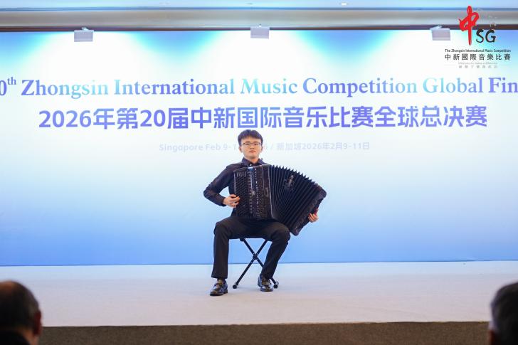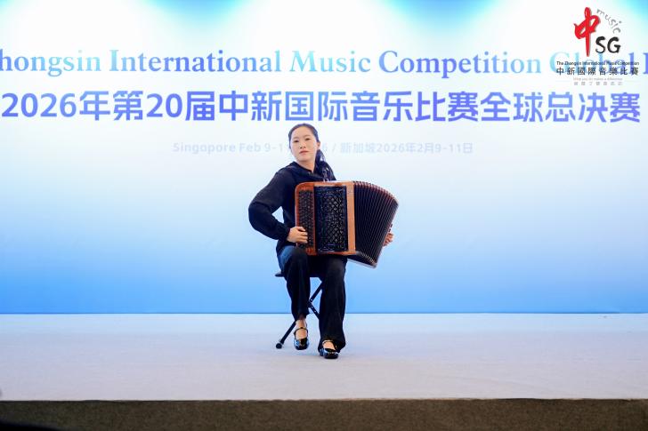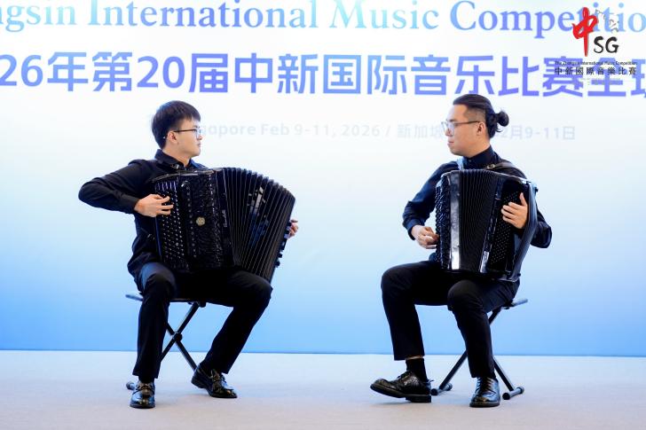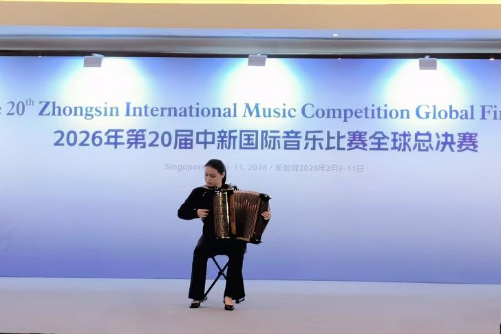 2026年2月9日—2月11日,第20届中新国际音乐比赛全球总决赛在新加坡圆满落幕。上海师范大学音乐学院手风琴专业方向的四位学生——封景锐(2025级键盘艺术表演(手风琴)专业方向硕士研究生)、夏语婷(2024级本科音乐学(师范)专业)、徐弋朗(2024级本科音乐学(师范)专业)和施乾浩(2025级本科音乐学(师范)专业)在西乐系主任王从余副教授及手风琴专业教师时璇老师的悉心指导下,凭借精湛的技艺与出色的舞台表现力,在该项国际赛事中脱颖而出,分别获得了开放作品组、自选流行作品组、自选民族作品组以及自选重奏/合奏组一等奖。值得一提的是,经国际评审团综合评分,封景锐同学最终以开放作品组最高分的优异成绩,斩获本届赛事最高荣誉。西乐系主任王从余副教授应邀担任赛事评委。