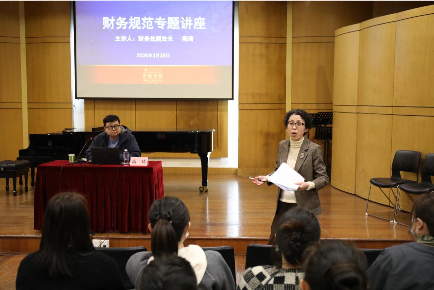 为切实解决教职工日常财务报销、经费管理中的实际问题,提升教职工财务业务办理效率与规范操作能力,精准做好教职工财务服务保障工作,3月25日下午,音乐学院特邀学校财务处副处长高琦,为学院教职工开展财务规范专题讲座,把专业、实用的财务指导送到教职工身边,助力学院各项工作有序开展。