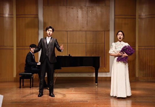 下半场是歌剧重唱专场,不仅有观众耳熟能详的民族歌剧《沂蒙山》中的女声二重唱《世间哪有这样的请》、歌剧《伤逝》中的男女二重唱《紫藤花》,更有歌剧《运河谣》中的女生二重唱《快快回到他身边》及著名音乐剧《猫》中的《猫之二重唱》,学生们在这些富有感情、活泼动听的歌曲中尽情演绎着,博得了台下师生们及校外观众们的阵阵掌声。