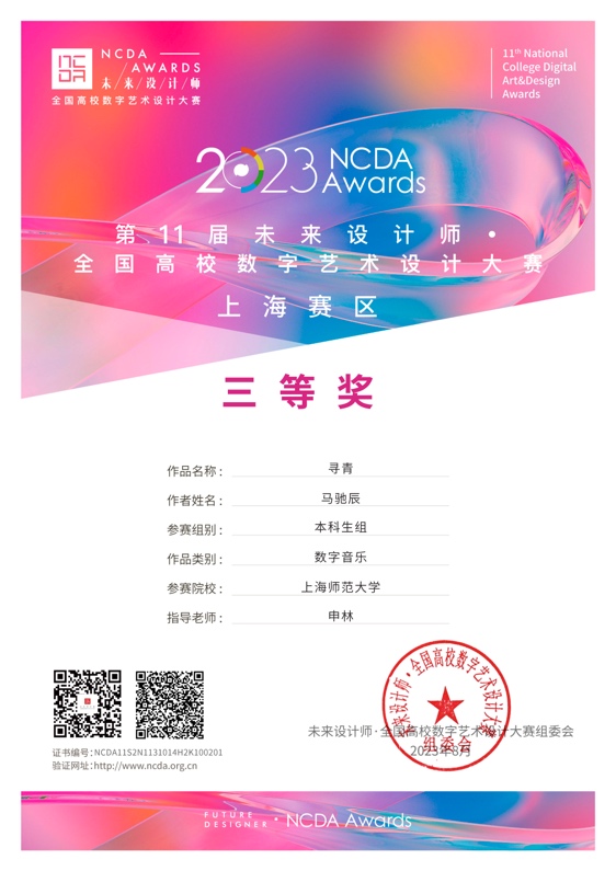 在由工信部人才交流中心主办,教育部中国高等教育学会认定,15个省教育厅发文立项,“学习强国”学习平台支持的国家级大学生竞赛“未来设计师·全国高校数字艺术设计大赛(NCDA)”中,由我院音乐科技系主任申林副教授指导的录音艺术专业2019级本科生张子竞,荣获全国三等奖、上海赛区一等奖、2022级音乐创作研究生刘莎丽荣获上海赛区二等奖、2020级音乐创作研究生钟山和录音艺术本科专业2020级本科生马驰辰获得上海赛区三等奖的好成绩。申林副教授获得上海赛区优秀指导教师证书。