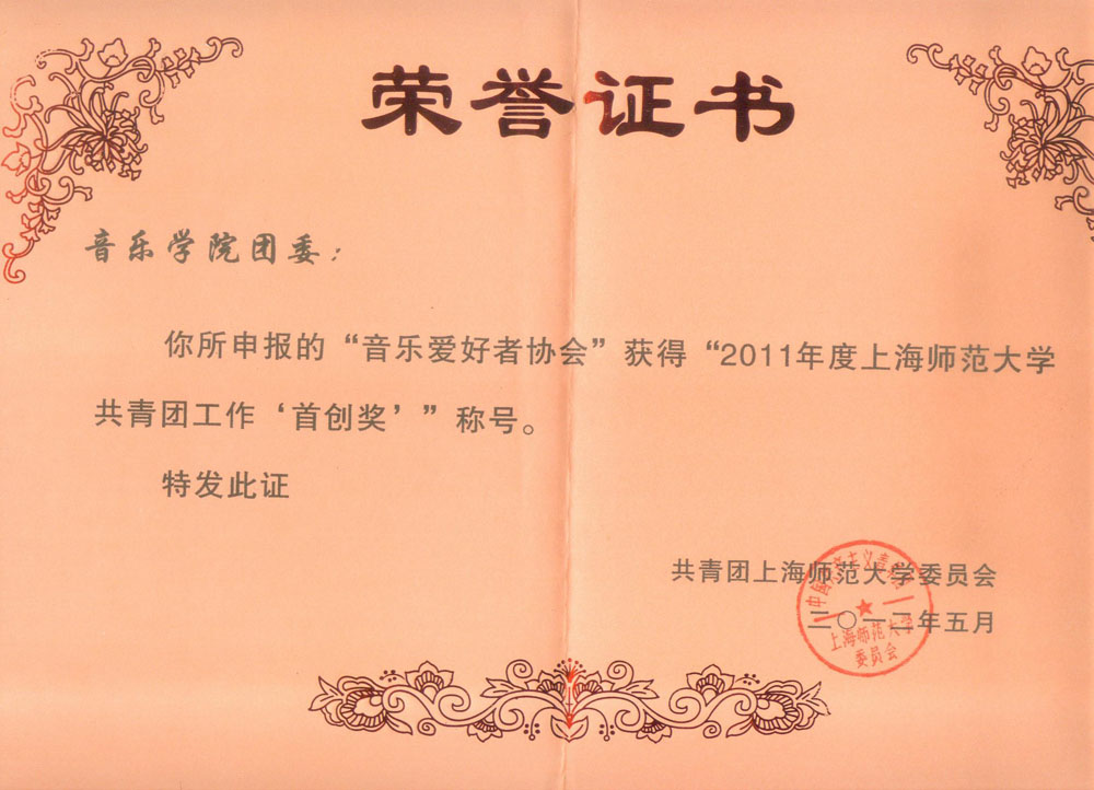 由我院团委申报的“音乐爱好者协会”获得“2011年度上海师范大学共青团工作‘首创奖’”称号。“音乐爱好者协会”是我院积极投入创办的具有我院特色的,利于学生发展的,覆盖面较广的课余活动组织。该荣誉的获得是对我院团委工作的充分肯定同时也给予我院创办这一协会并使其继续壮大力量注入新的活力的动力和支持。