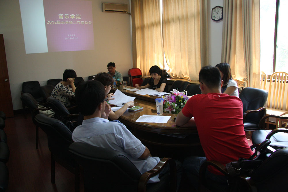 9月11日中午, 音乐学院2012级新生班导师工作启动会正式举行。党总支书记金国忠老师、副书记张玮老师以及全体2012级新生班导师共同出席了会议。学院正式宣布了对新一轮班导师人员的任命决定,学院五位教师受聘担任2012级的班导师工作。