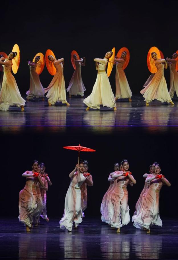 李彬副教授是美国纽约州立大学公派艺术类访问学者,曾主持和完成国家艺术基金“青年艺术创作人才”资助项目,并在历届“桃李杯”“荷花杯”“全国舞蹈比赛”“央视舞蹈大赛”“全国大学生艺术展演”等国家级舞蹈大赛中屡获表演和创作奖项。群舞《青春下的红油伞》将民族民间舞的素材揉碎、重组,呈现出当代青年人的生命情态。作品中表现了一群充满朝气,青春向上的新江南女孩,她们手持“红油伞”,舞出了最美好的青春年华与时代旋律,她们时而将“红油伞”轻放肩头眺望远方,传递着希望与勇气;她们时而 将“红油伞”高高举起仰望星空,以跳跃的律动表达着青春追梦的澎湃激情;