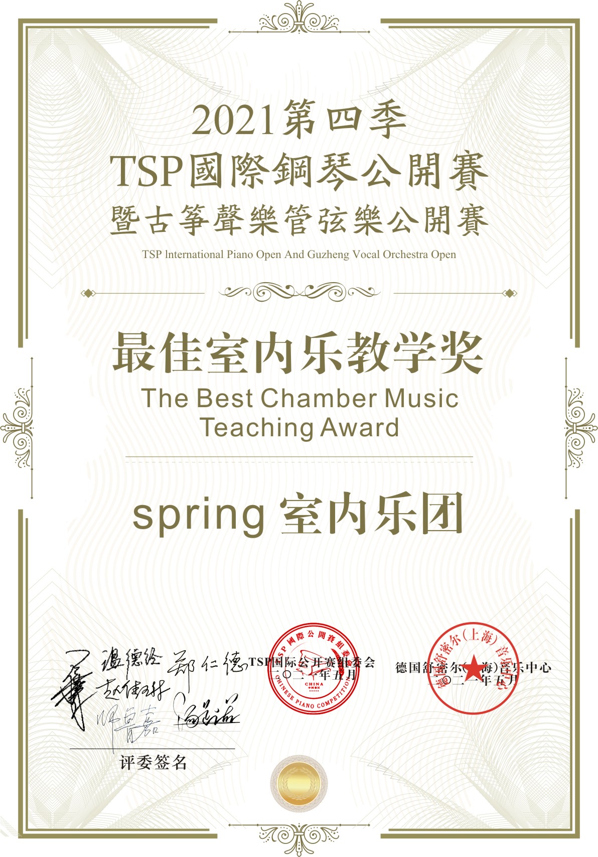 近日,我院SPRING乐团佳绩频传,获得的奖项包括:第7届国际青少年钢琴家比赛中国赛区选拔赛室内乐组二等奖。2021马格鲁斯皇家青少年钢琴比赛四手联弹高级组银奖。2021中国青少年音乐比赛蜂鸟音乐奖四手联弹二等奖。2021中国青少年音乐比赛蜂鸟音乐奖最佳室内乐教学奖。2021第四季TSP国际钢琴公开暨古筝声乐管弦乐公开赛室内乐一等奖。2021第四季TSP国际钢琴公开暨古筝声乐管弦乐公开赛最佳室内乐教学奖。