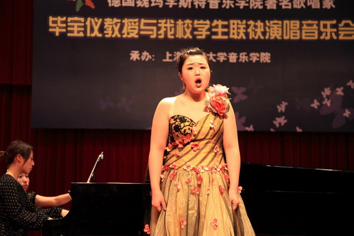 当晚,毕宝仪教授与我院学生联袂举行了一场音乐会。毕教授演唱了勃拉姆斯的声乐套曲《吉普赛人之歌》以及罗西尼的歌剧《塞维利亚理发师》、梅耶贝尔的歌剧《清教徒》、斯特劳斯的歌剧《蝙蝠》中的几首咏叹调。毕教授高超的演唱技艺、完美的舞台表现力和对作品精准的诠释表达令我院师生折服。我院同台参加音乐会演唱的学生有:徐忠莹(杨清教授的学生)、李京宪(周进华教授的学生)、曹琳(钱晓平老师的学生),她们在舞台上的表现也得到了国外专家的首肯和赞赏。