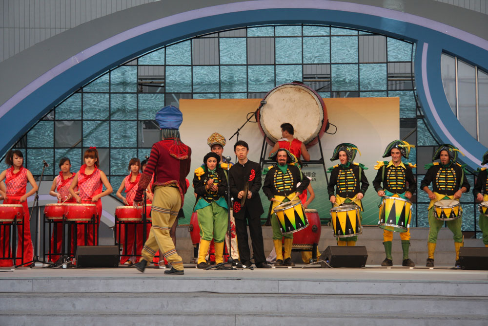 舞台分为三层,正如所有六个团队分为三组那样:下面是中国舞狮与法国大型木偶,中间是我们的同学与法国管乐团,上面是绛州鼓乐团与法国打击乐团,两侧还有中国狮子跳梅花桩与法国的高空表演(两侧项目由于危险系数较高,没有在世博园区进行演出)。我们与绛州鼓乐团合作了《金蛇狂舞》,还与所有团队合作演出了多首曲目,有中国传统的《龙腾虎跃》,也有法国式的《Iberik》,还有法国艺术家专门为世博会谱写的《L'orient expo》。