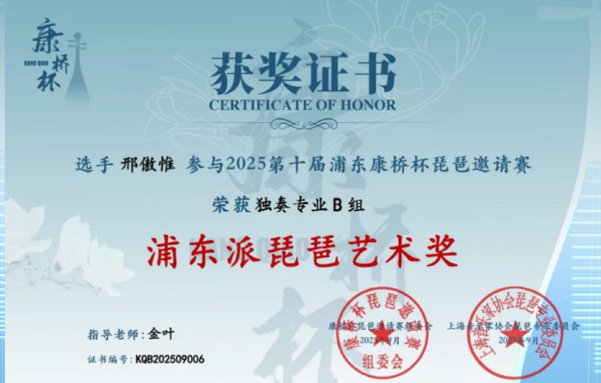 “浦东派琵琶艺术鼓励奖”