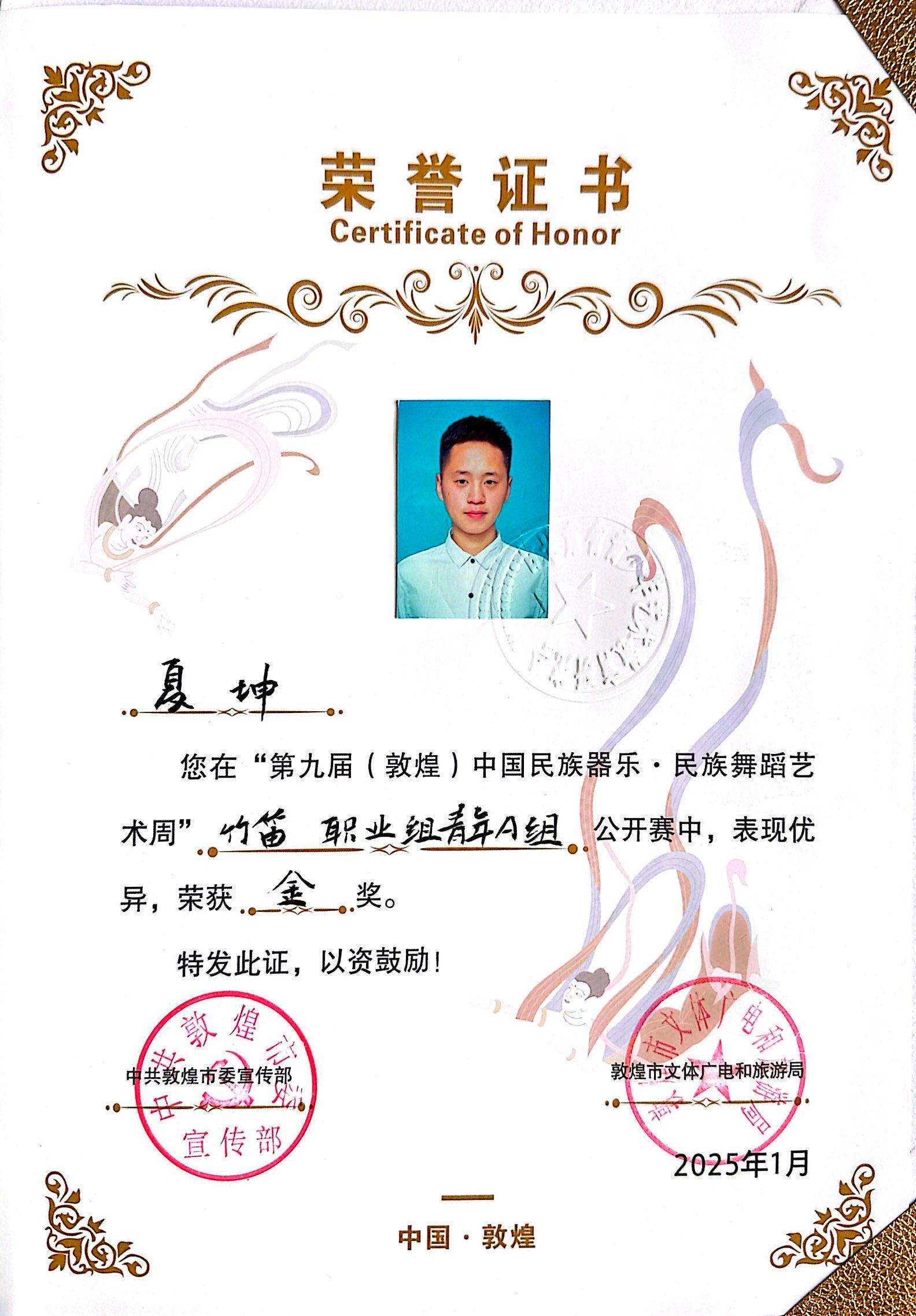 2024级研音乐民族器乐表演班 夏坤,获职业青年B组金奖;