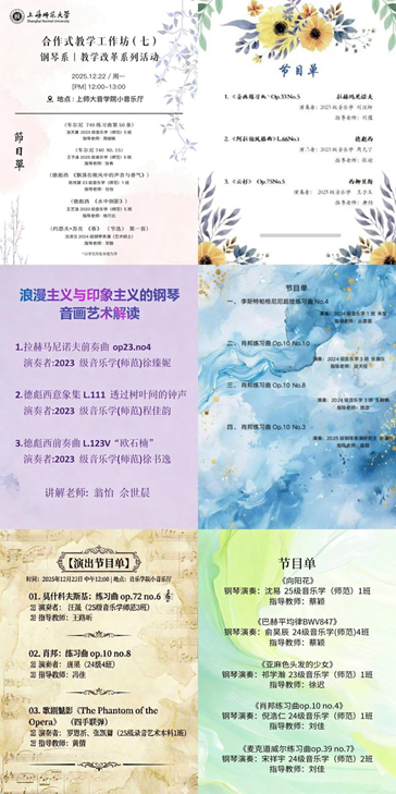 在本学期的六场工作坊中,钢琴系教师们以小组为单位,通过不同的教学方法、讲解方式和多维度的音乐诠释,针对学生演奏过程中的具体细节和处理方式,给予了生动详细的点评与指导,帮助学生多层次、多角度地理解和领悟作品中的细节和技术要点。教师们以自身丰富的舞台经验,为学生打开了多元的舞台表演思维空间,启发学生对于音乐作品的独立思考和探索意识,获得理论与实践上的共同成长。通过这种全新的教学方式,既让学生们通过聆听同学们的演奏和教师们的点评分析,更为客观深入地反思了自身存在的问题;也让教师们打破教学壁垒,走出自己的琴房,在相互取长补短中弥补教学盲区、提高教学质量。